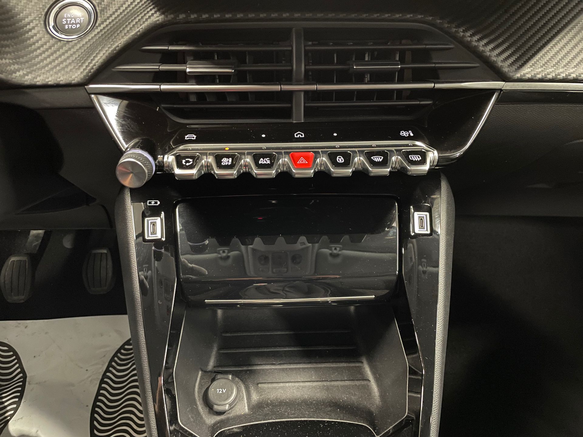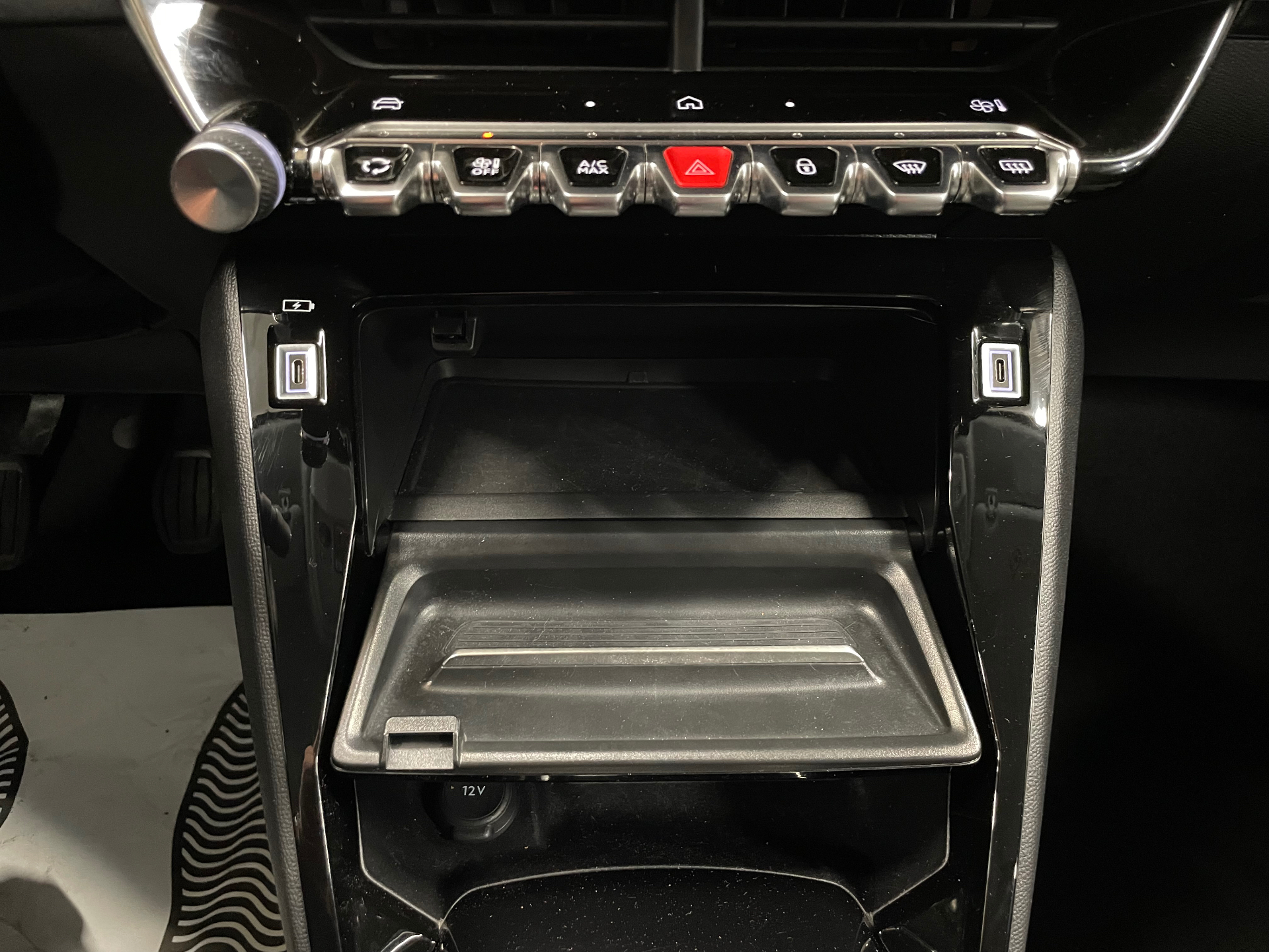 Prise 12V et rangement pour smartphone en facade centrale