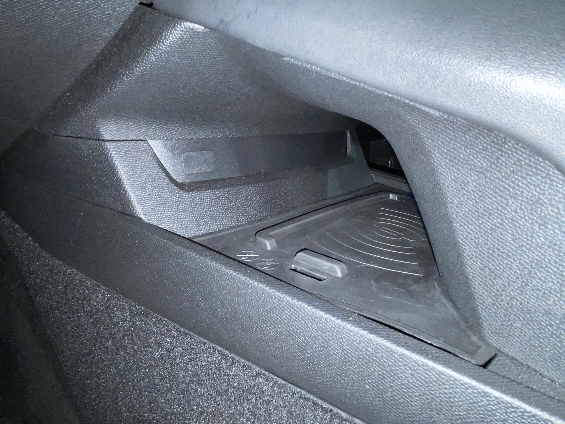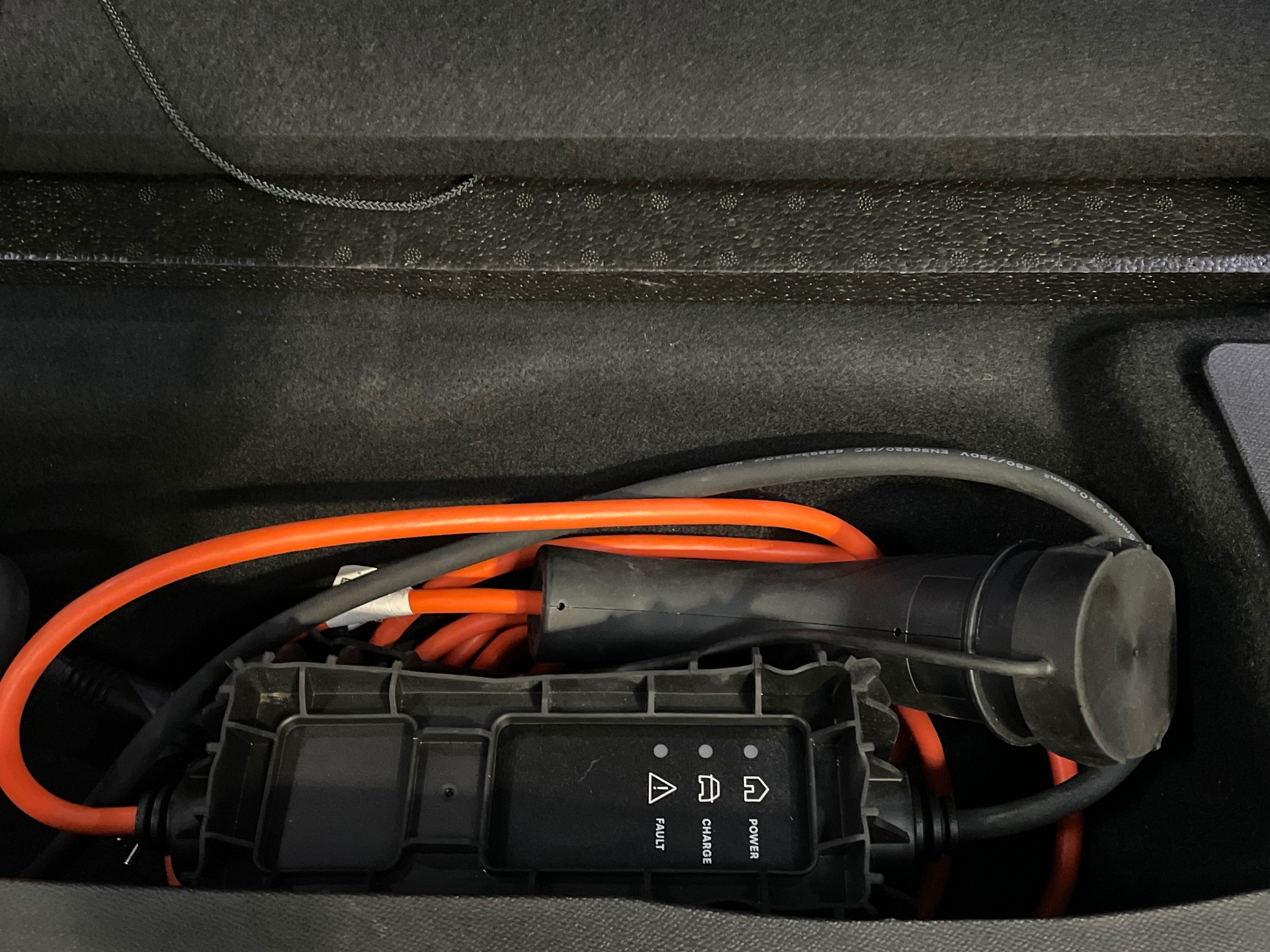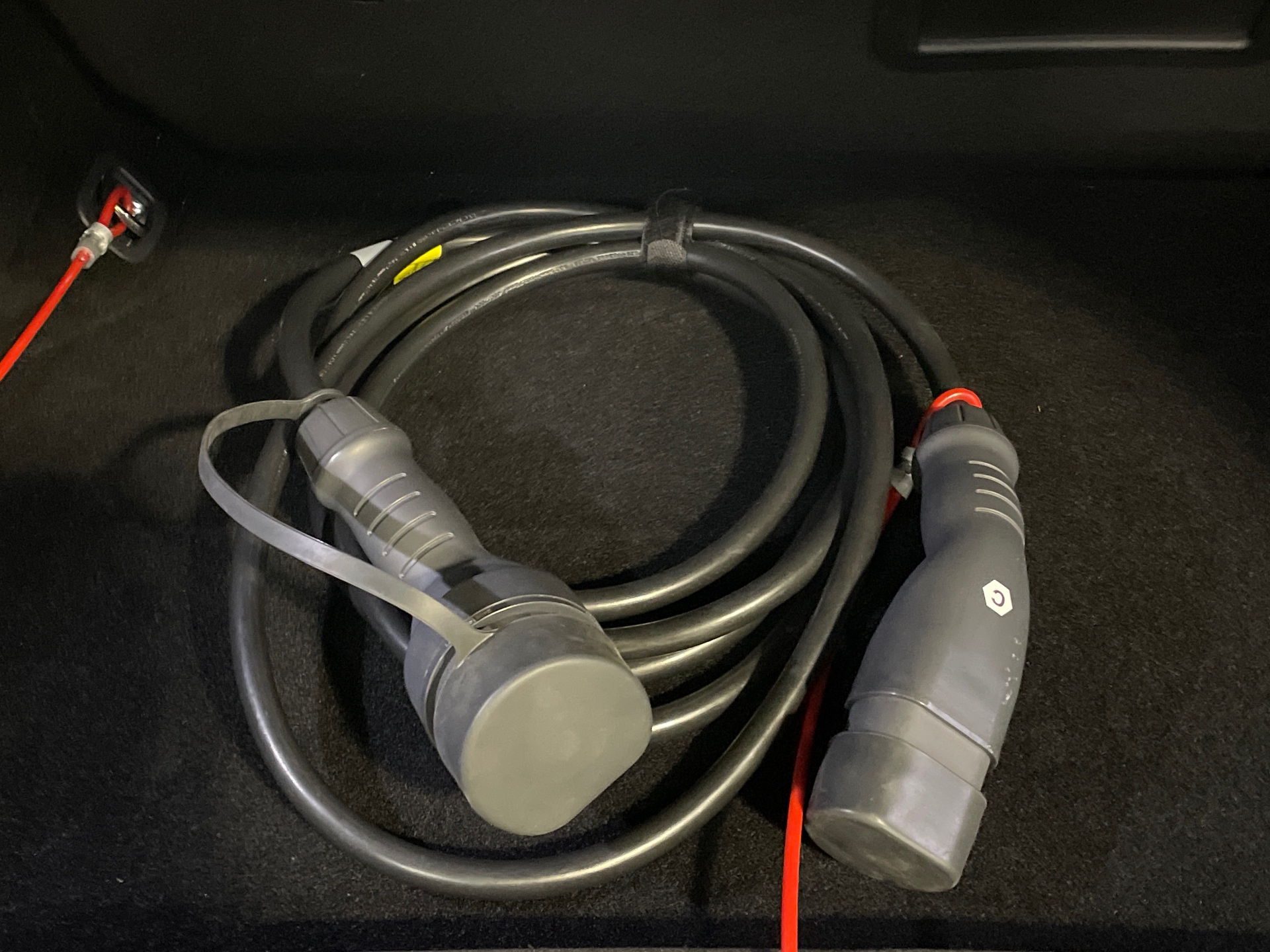 Tapis de coffre avec articulation pour acces a l'espace de rangement du cable de recharge